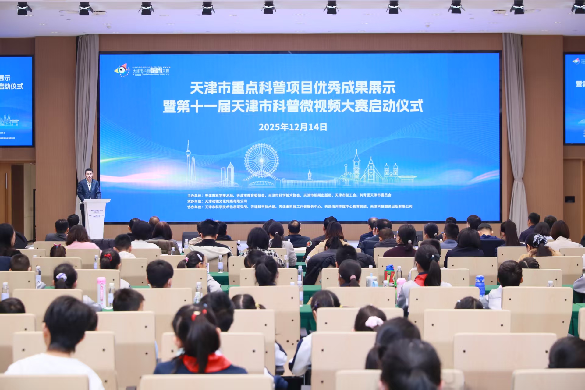 活动在回顾本市重点科普项目成果的综合视频中拉开序幕,通过优秀作品视频播放、情景短剧表演、科普演讲、科学实验展演及科普图书分享等多种形式,集中展示了我市在科普载体建设、品牌活动打造、青少年科学教育等方面取得的突出成绩。与会领导为本年度天津市科普微视频大赛、科普讲解大赛、科学实验展演汇演活动的获奖选手代表颁发了证书,为2025年新认定的天津市科普基地代表授牌,并共同启动了第十一届天津市科普微视频大赛。